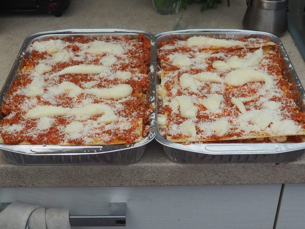Place a thin layer of meat sauce, for the recipe click on the link (use the doses indicated in the recipe) on both trays, cover with a layer of lasagna (for the recipe of the fresh pasta click on the link (use half the dose indicated in the recipe).