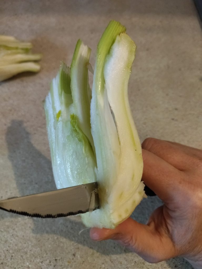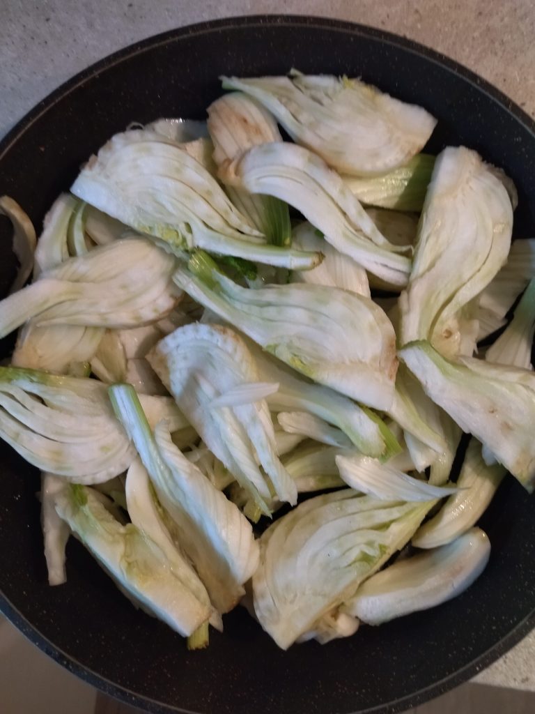 Wash the fennels, remove the tougher parts and outer strings. At this point, cut them in half and then into not too small wedges.
