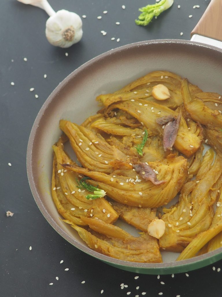 Pan-fried Fennel with Anchovies is a very tasty dish. To give it even more flavor, I added some garlic cloves and a bit of turmeric (which you can obviously omit if it’s not to your taste).