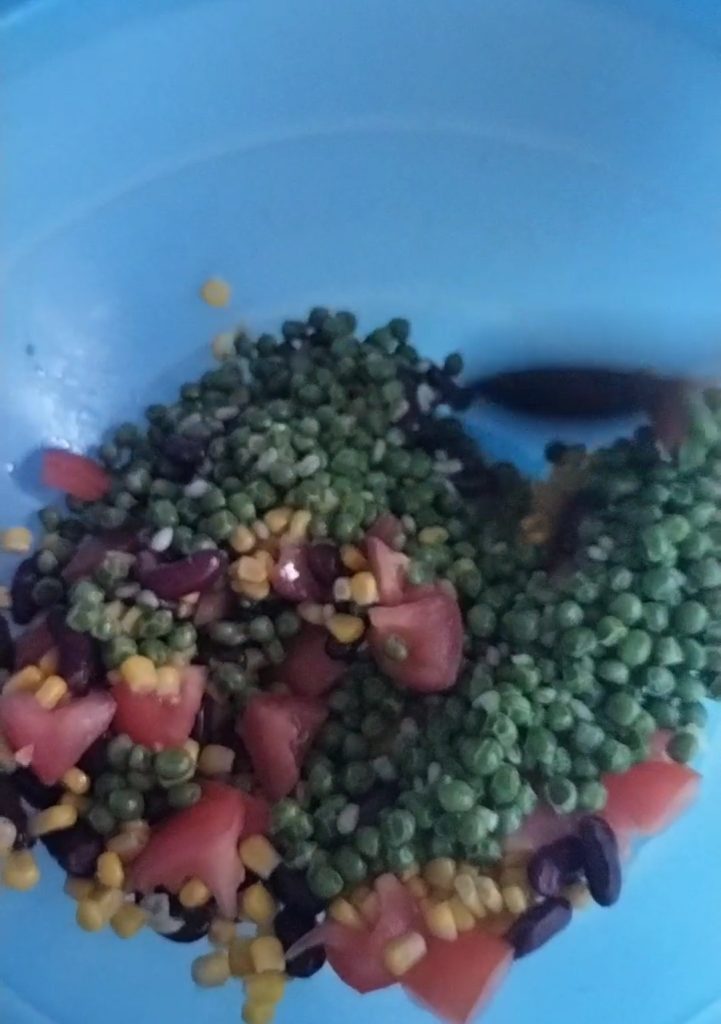 • Wash and dice the tomatoes, put them in a large bowl, season them lightly with salt. Add the corn and drained red beans, mix the ingredients.
