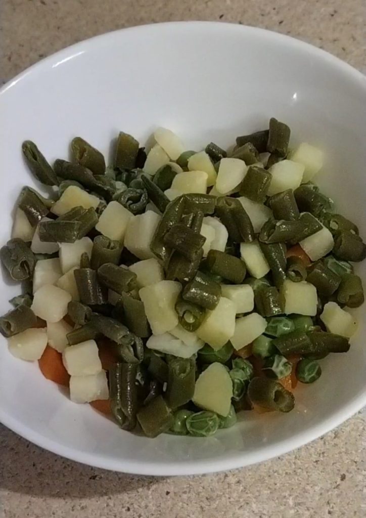 Wash the vegetables and cut them into fairly small cubes, roughly the same size. Fill a pot with water, when it boils, add a pinch of salt and cook the potatoes. They should still be a bit firm, not falling apart. Drain them and place them in a bowl.