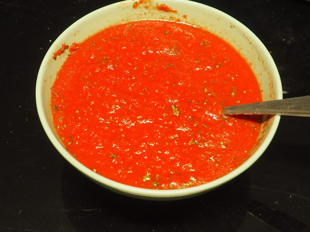 Place the tomato sauce in a bowl and season it with oregano, fine salt, and olive oil.