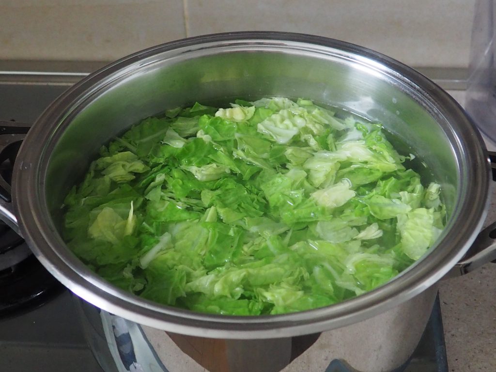 Put plenty of water in a pot, once it boils, salt it, add the cabbage and diced potatoes. Boil for about 5 minutes.