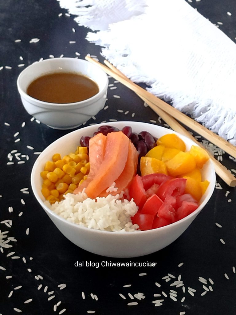With this heat, the desire to cook is less and less. This Poke bowl with rice, salmon, and peach is really fresh and ideal during the summer. You can replace the peach with watermelon and, if you want, add cucumber, depending on your taste, it will always be super delicious, thanks to the dressing, a very tasty mix! Below I reveal the ingredients to create a sauce that will enhance your dish.