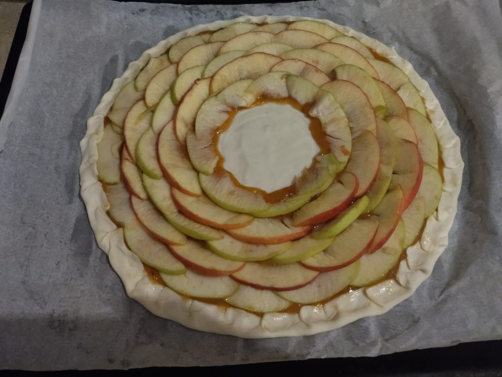 Finish by making alternating circles of apples with different colored skins, if you chose not to peel them. Close the outer edge with small pleats towards the inside of the pastry.