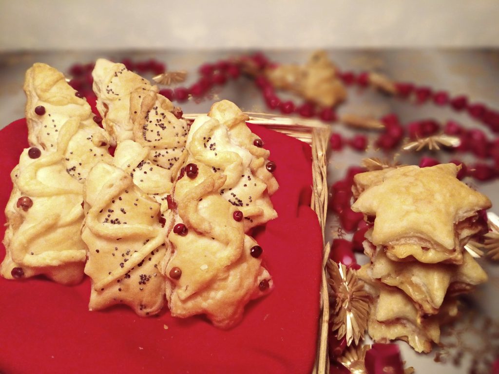 Decorate the trees with small strips of puff pastry (resembling decorations), poppy seeds, and pink peppercorns.