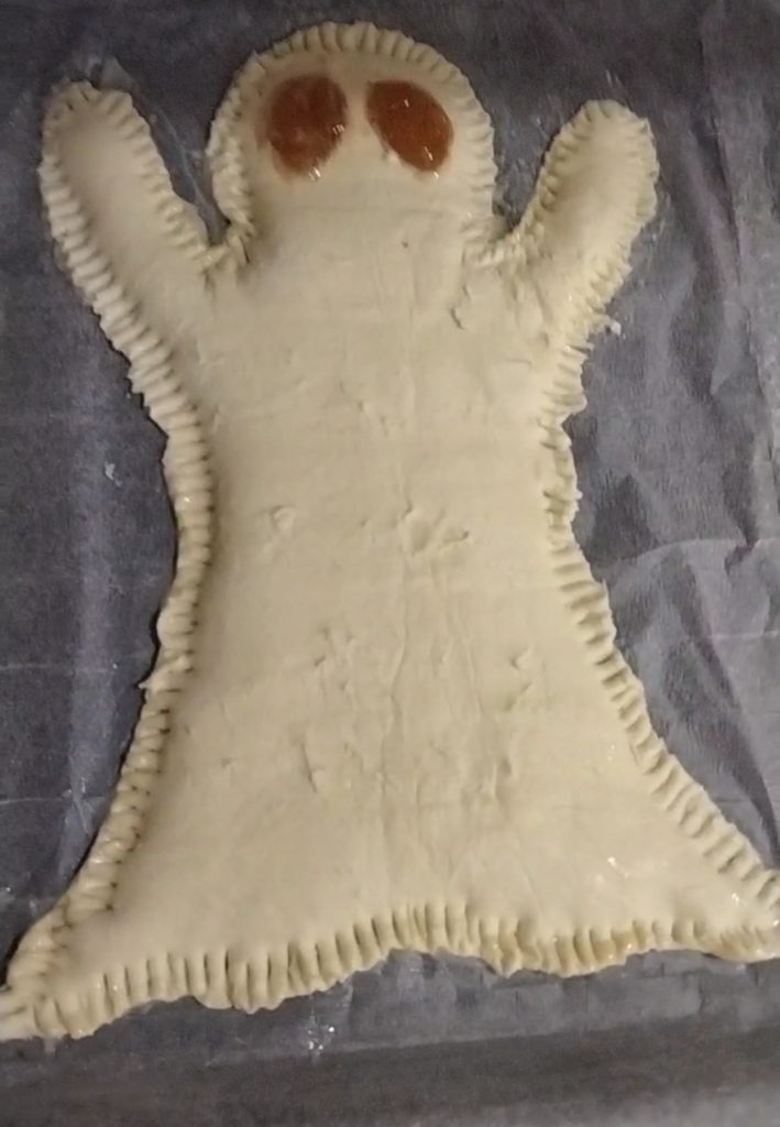 If you are good at drawing, you can avoid cutting out the ghost from baking paper by carving it directly on the puff pastry.
