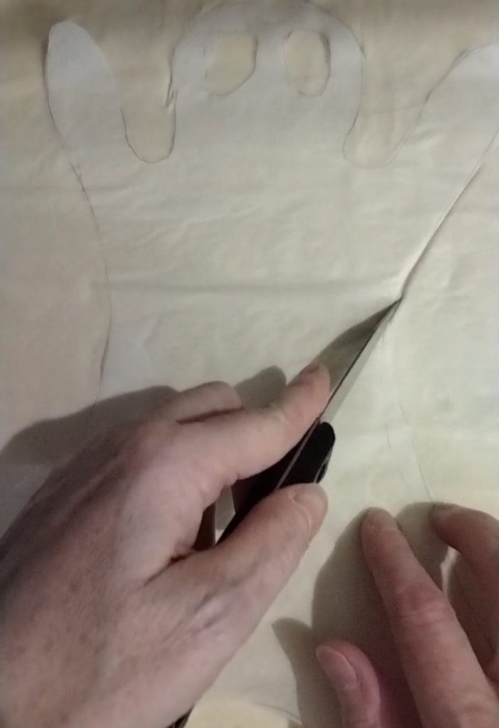 Now cut out the shape with scissors. Position the cut-out ghost on the first sheet of puff pastry. Cut the edges with a knife.