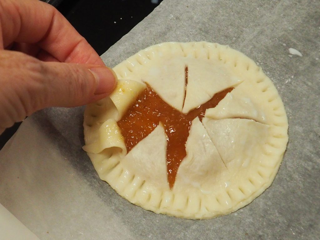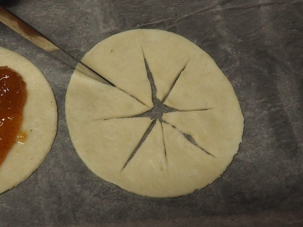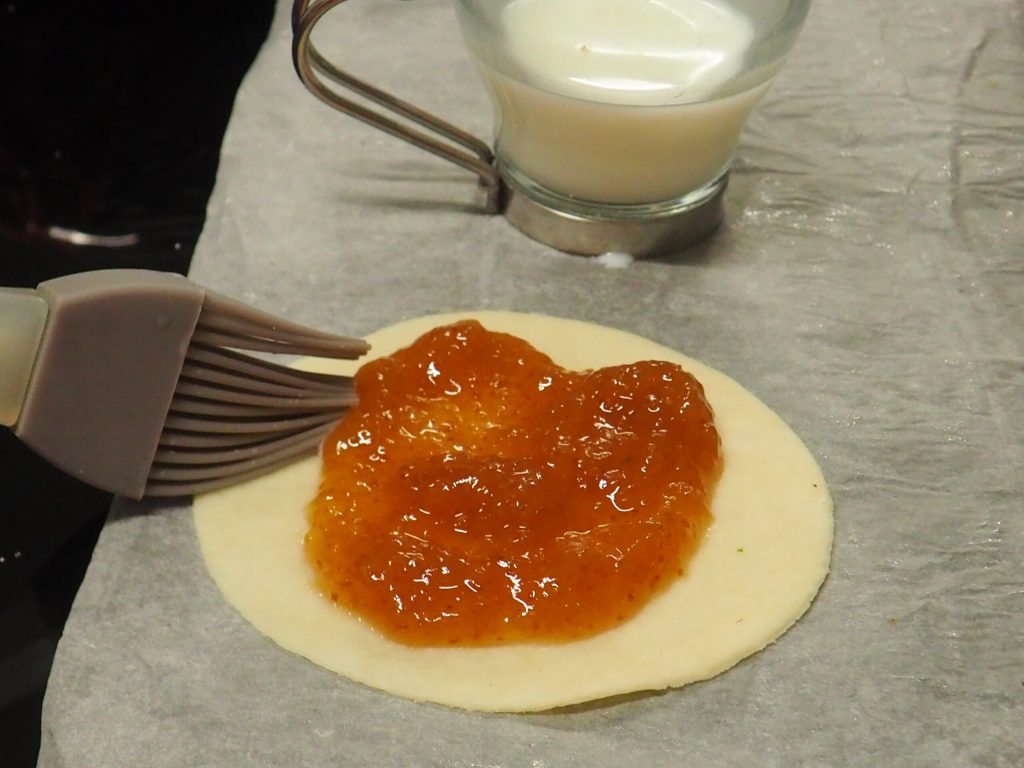 • Roll out the puff pastry on parchment paper, cut a circle with a 4-inch cookie cutter, and place a generous teaspoon of jam on top. Brush the edges with a bit of milk.