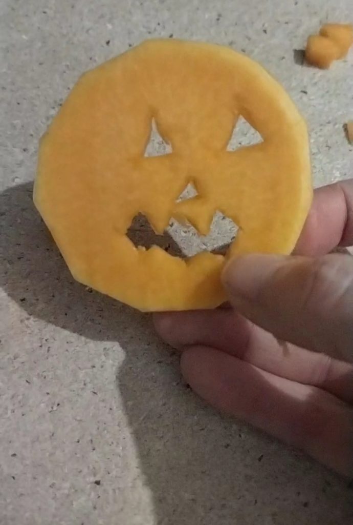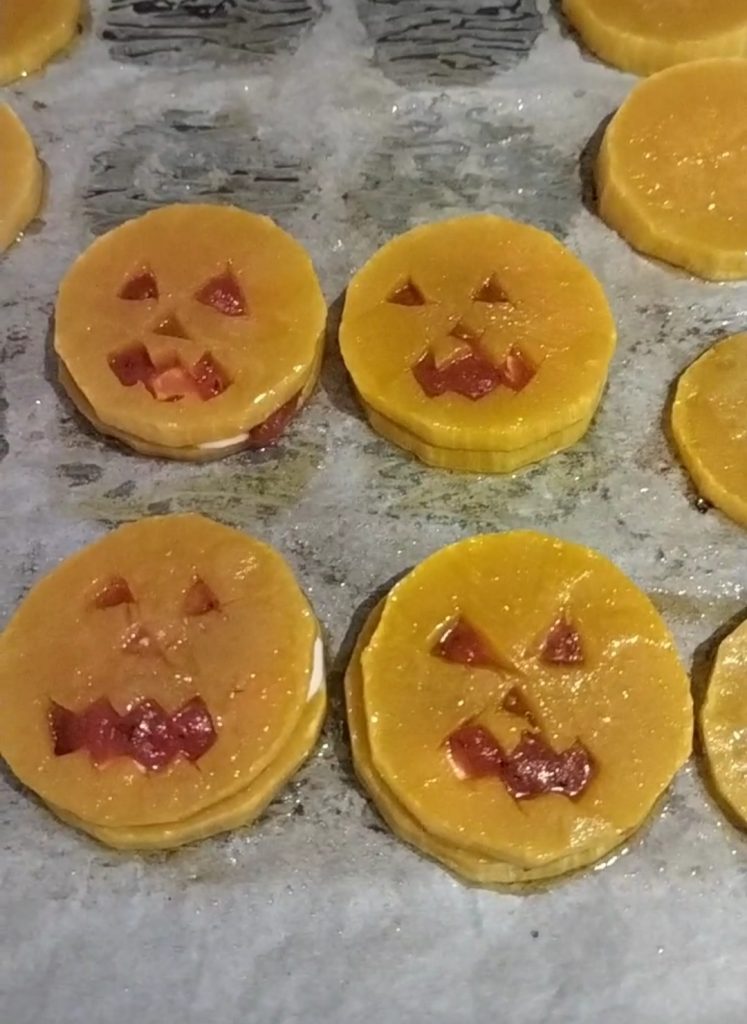 • Cover the bases with the slices with carved faces. Bake again at 356°F for about 10 more minutes. You can add a bit of oil and salt on the surface to make them even more flavorful.
