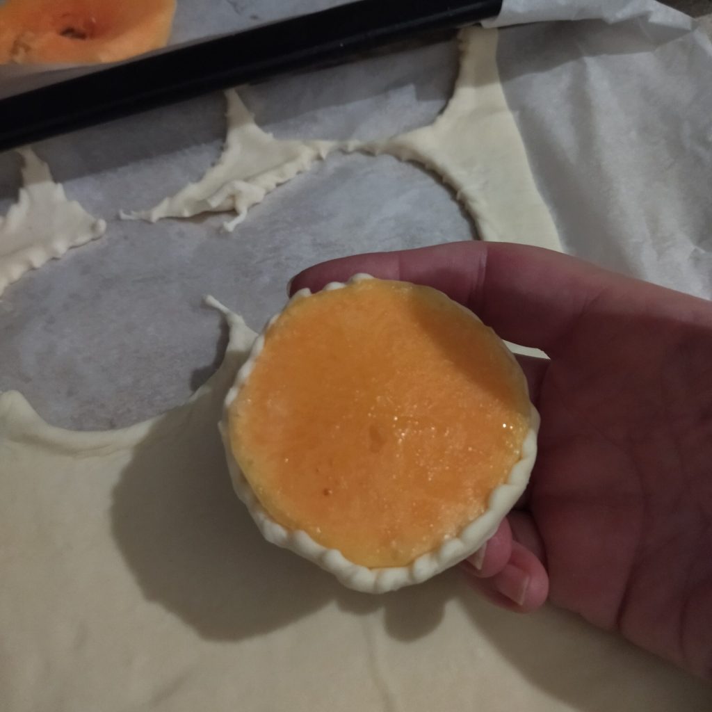 • Cover the bottom part of the pumpkin slice with the puff pastry, covering the edges. Continue this way with all the pumpkin slices.