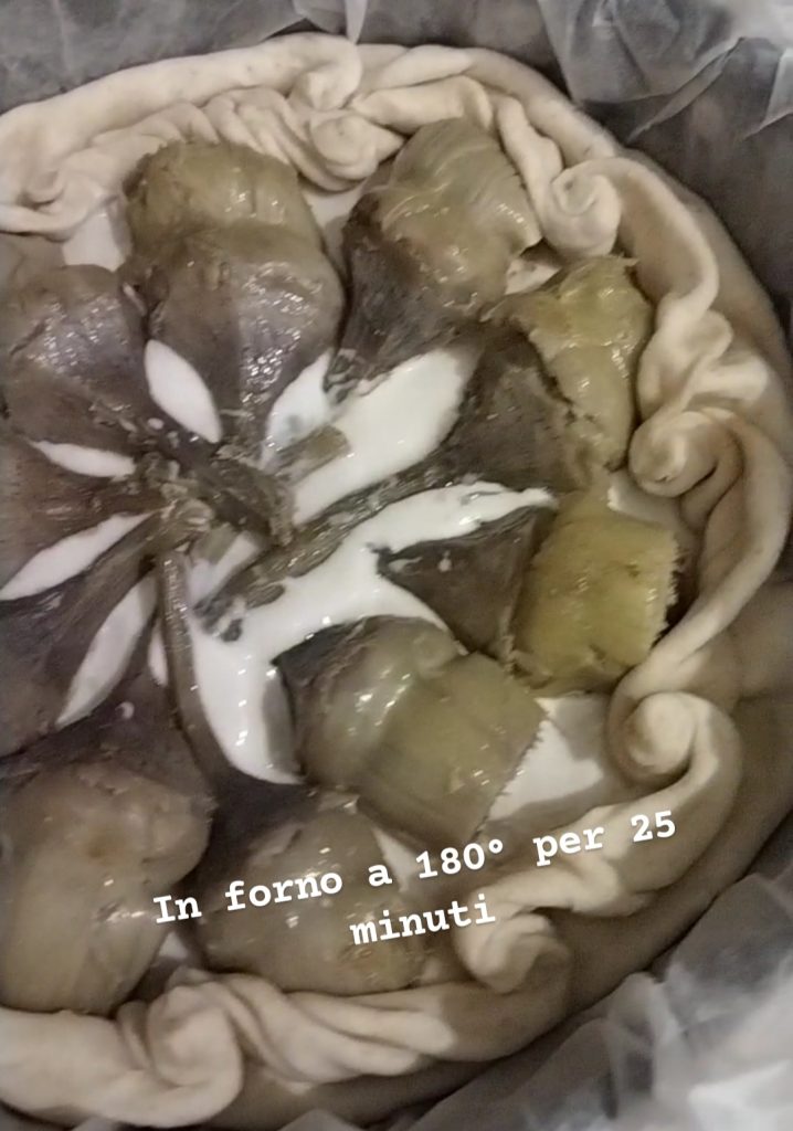 Place the artichokes inside the baking pan. Try to roll up the excess puff pastry edges and then arrange it around the artichokes like a crown. Season the surface with a bit of salt and olive oil, bake at 350°F for about 25 minutes.
