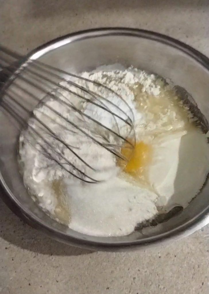 • In a bowl, mix all the ingredients together: flour, baking powder, sugar, egg, milk, oil.