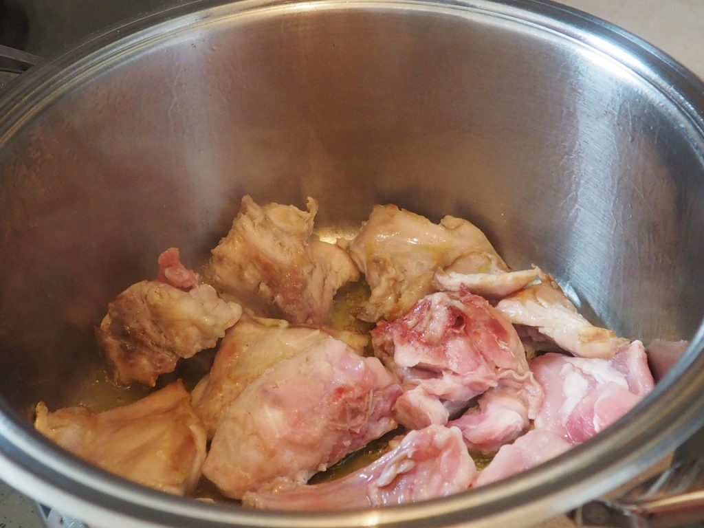 • At this point, remove the rabbit pieces, let them cool slightly, and debone them, shredding as much as possible.