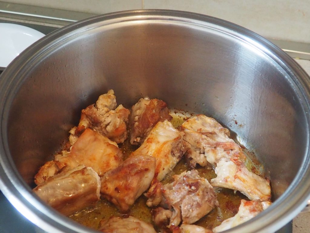 In the same pot where you browned the rabbit pieces, add the vegetables and sauté them.
