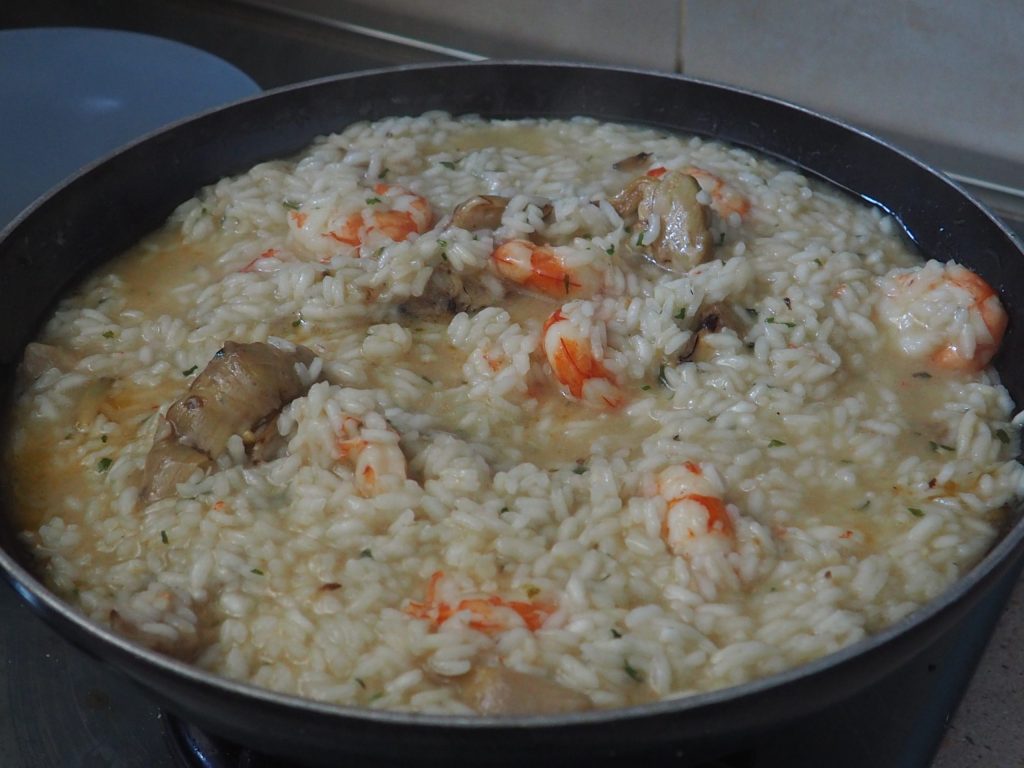 Risotto with Artichokes and Prawns is a really tasty and rich main course, an excellent combination of flavors. I used artichokes in oil, if you prefer to use fresh ones you will need to clean, slice them, put them in a pan with some oil and water and cook them until they become tender but still crisp. If you use fresh artichokes you will need seven (it also depends on the size of the artichokes you use).