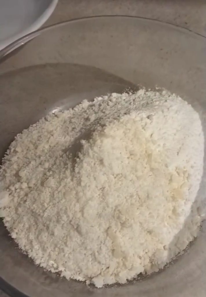 In a bowl, start by placing the dry ingredients: mix the flour with the Parmesan.