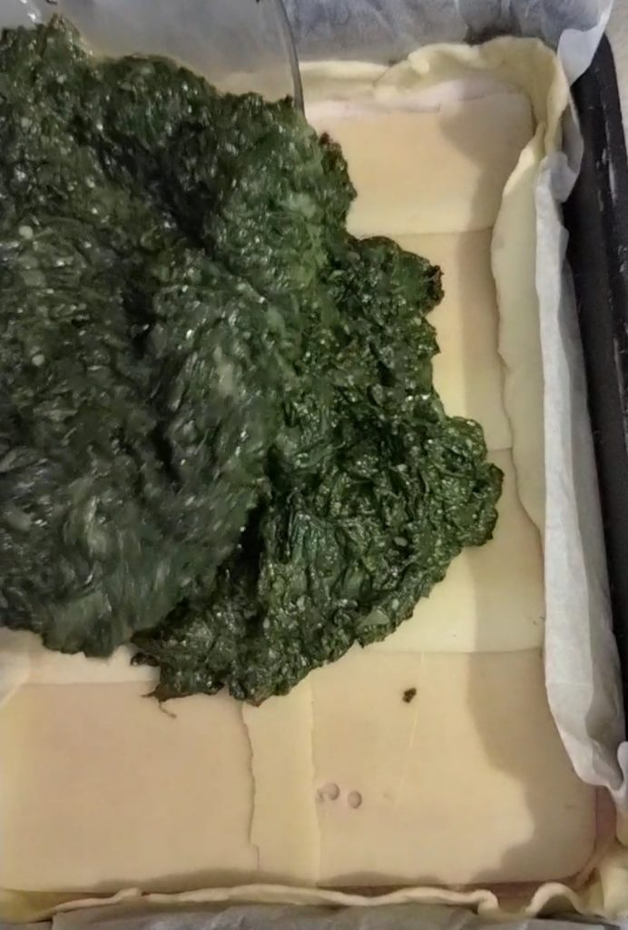 Cover a baking tray of dimensions 12×9 inches with parchment paper, and place the puff pastry on top. Pour the spinach mixture inside.