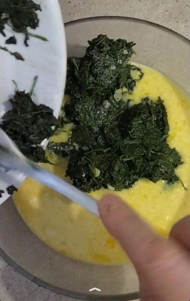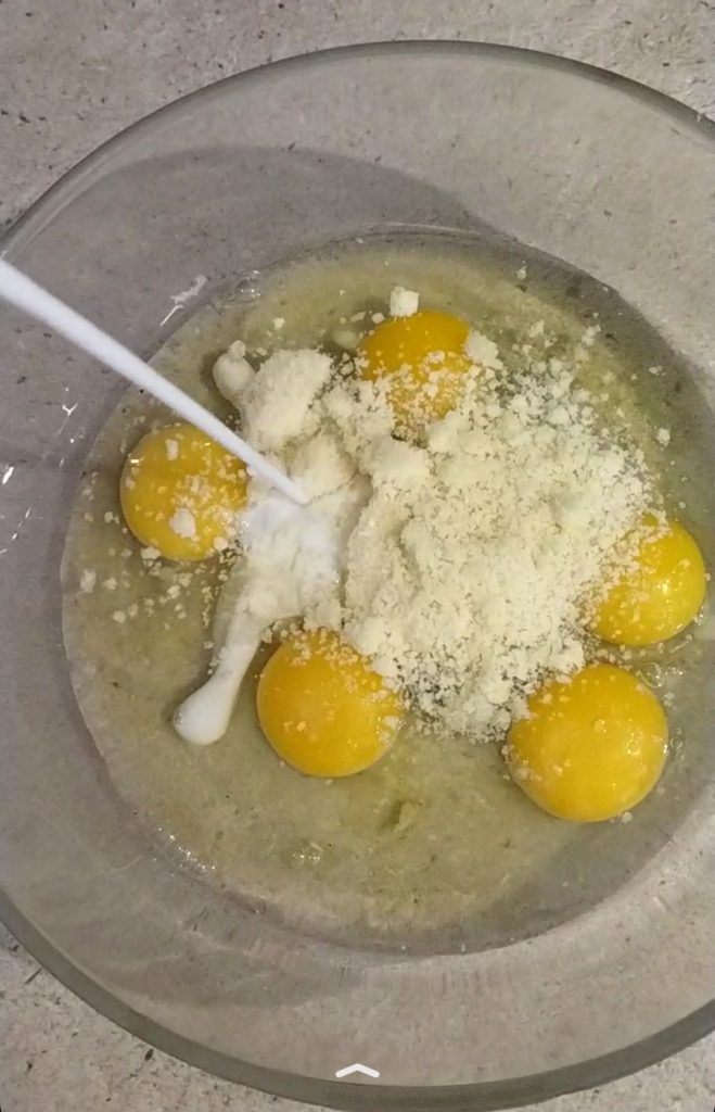 In a bowl, place the eggs (I put 5 first and then added the last one with the spinach, but you can also put all six together), the grated Parmesan cheese, the milk, and beat well with a whisk.