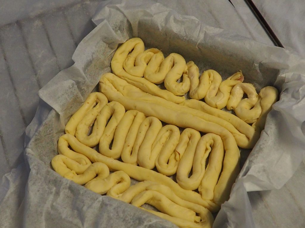 Now take a square baking tray of 8×8 inches, cover it with parchment paper, and place the filled strips irregularly. You need to give the idea that they are intestines.