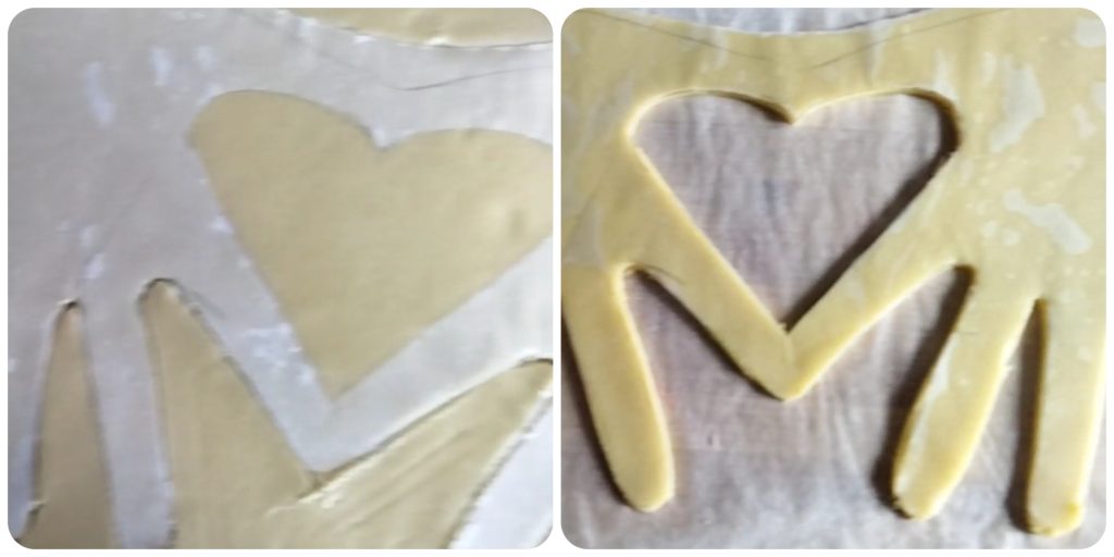• Take the shortbread out of the fridge, roll it out on a sheet of parchment paper with a rolling pin to a height of about three-quarters of an inch, place the hands cut out of parchment paper on top, and cut along the edges with a sharp knife. Do not cut the heart in the middle, as this will be the base of your tart. Place in the freezer for about half an hour, placing the form with the parchment paper on a cutting board.