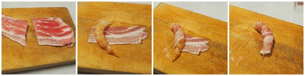 Cut the bacon slices in half, then wrap half a slice of bacon around each shrimp.
