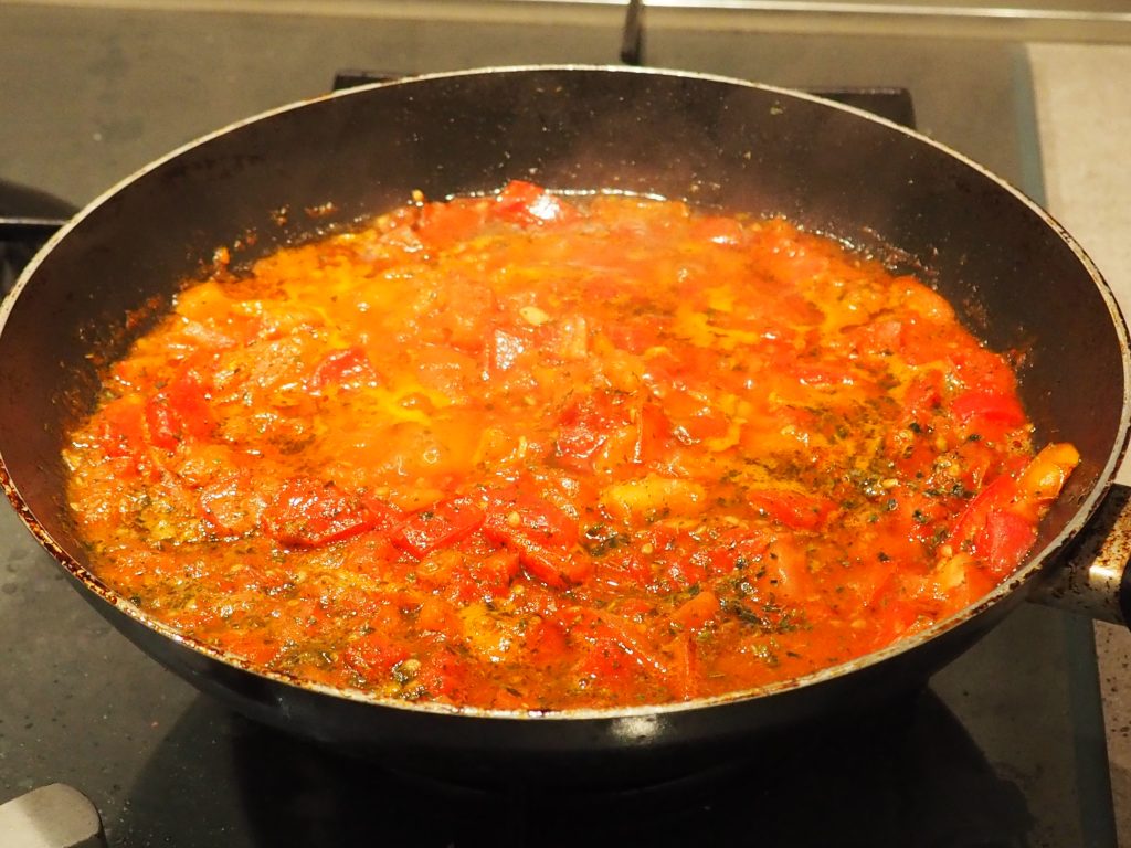 Put a bit of oil in a pan, the minced garlic clove, diced tomatoes, a bit of fine salt, oregano and cook for about half an hour.