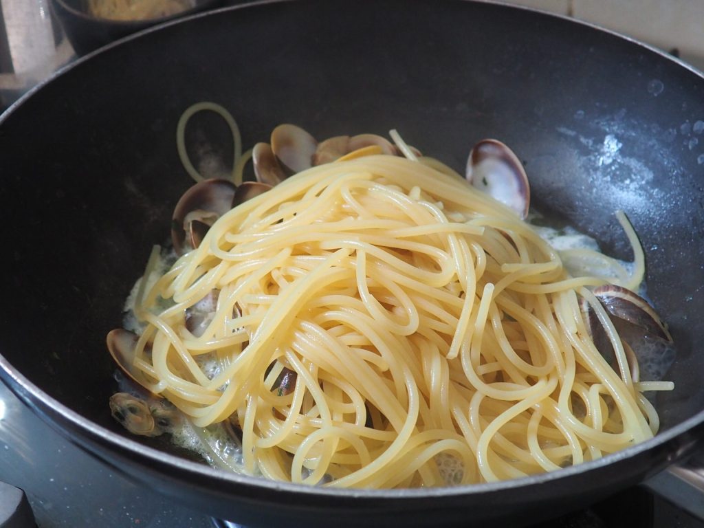 Halfway through cooking, drain the spaghetti with the appropriate spoon and place them directly into the pan with the clams, adding chopped parsley and ground black pepper.