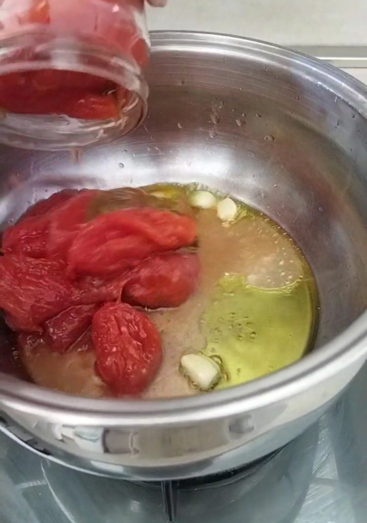 Put a little oil, garlic, tomato puree, and peeled tomatoes in a pot.