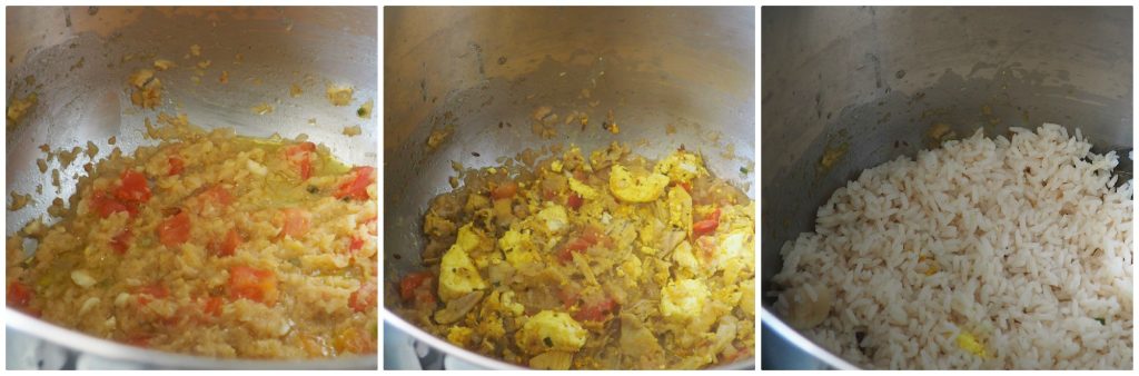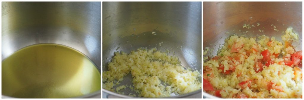 In a large non-stick pot, add a bit of oil, once hot, fry the onions and chopped garlic for a few minutes.
