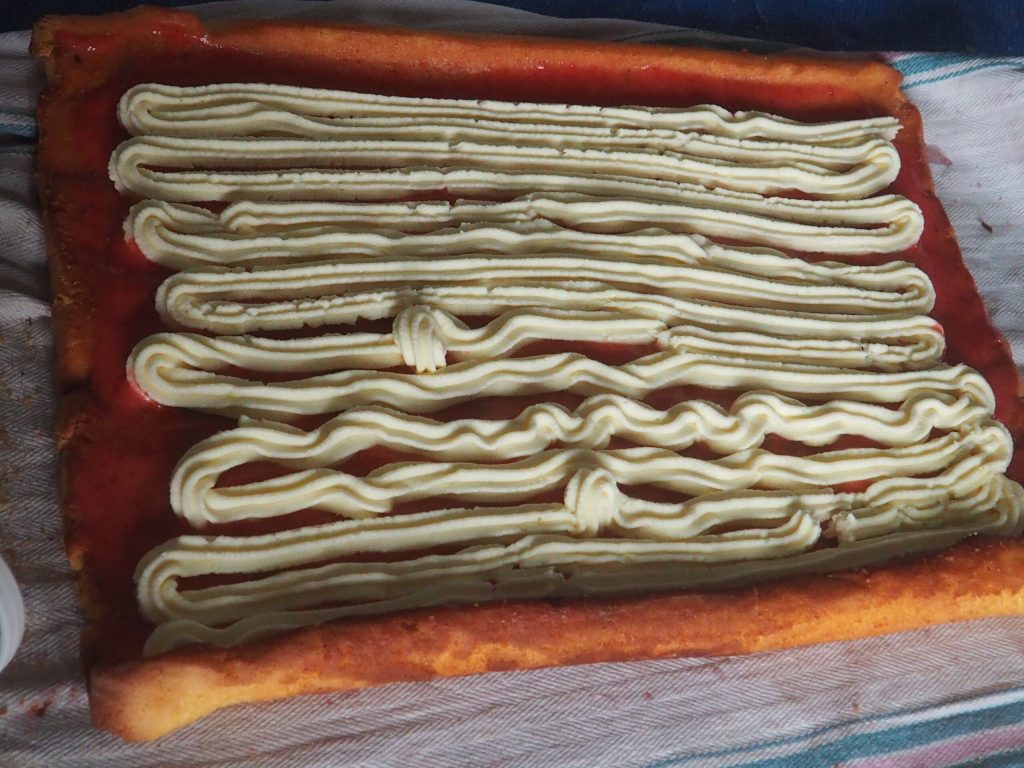 • Using a syringe, cover the surface with mousseline cream, leaving the edges free for at least half an inch.