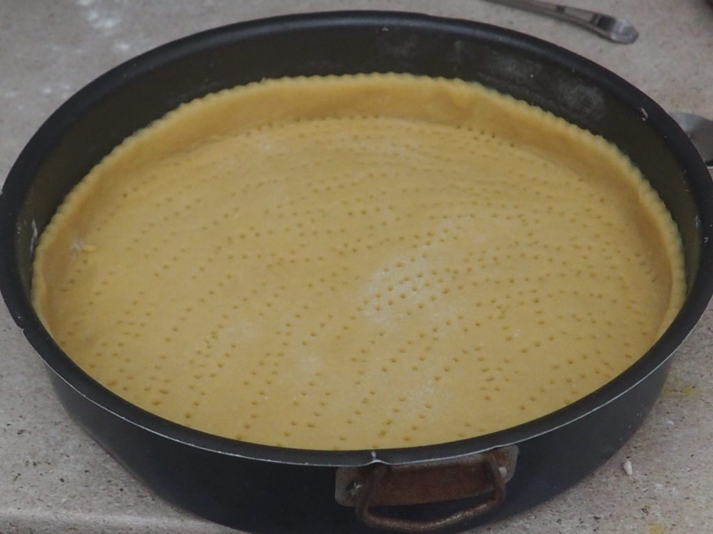 Remove the shortcrust pastry from the fridge, roll it out on a floured surface with a rolling pin to a thickness of 1/4 inch.
