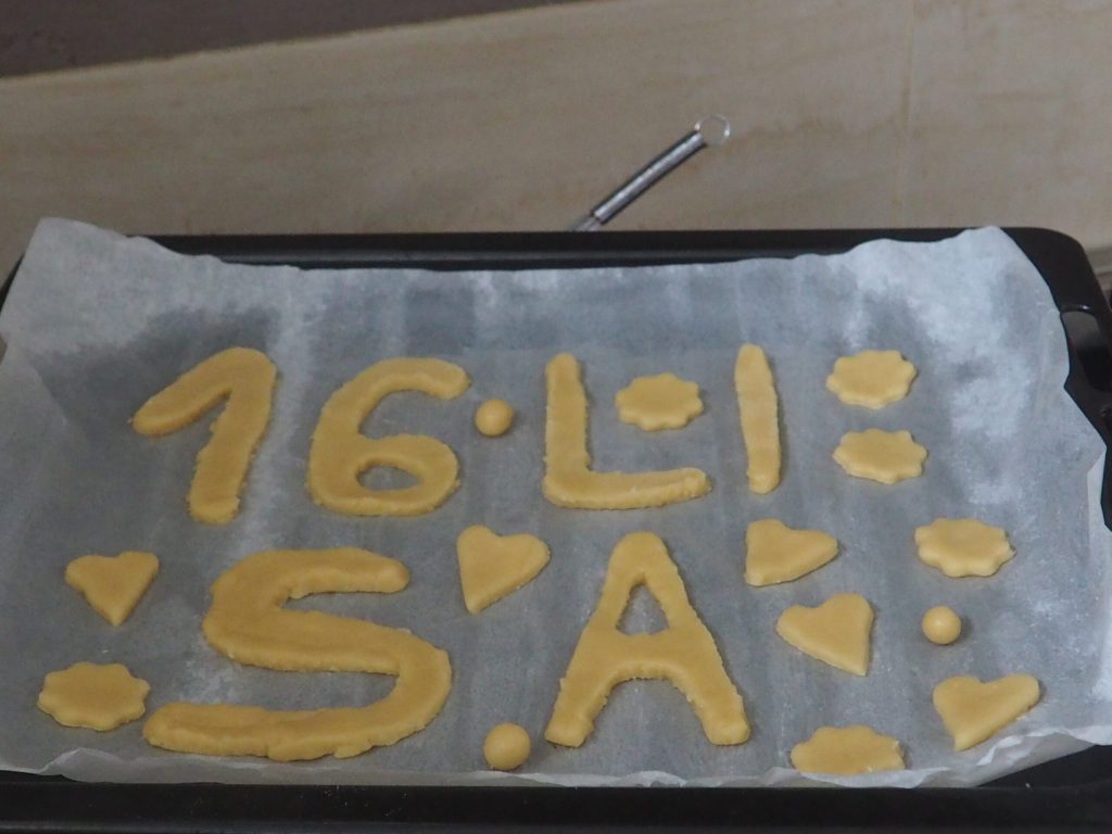 With the remaining pastry, I cut out letters, numbers, and shapes with heart and flower cookie cutters. Cover the baking tray with parchment paper, place the cookies, and bake for about 10/12 minutes at 350°F.