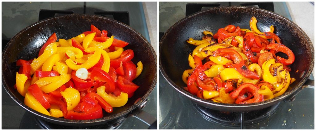 In a pan, add a little oil, a clove of garlic, and the pepper strips.