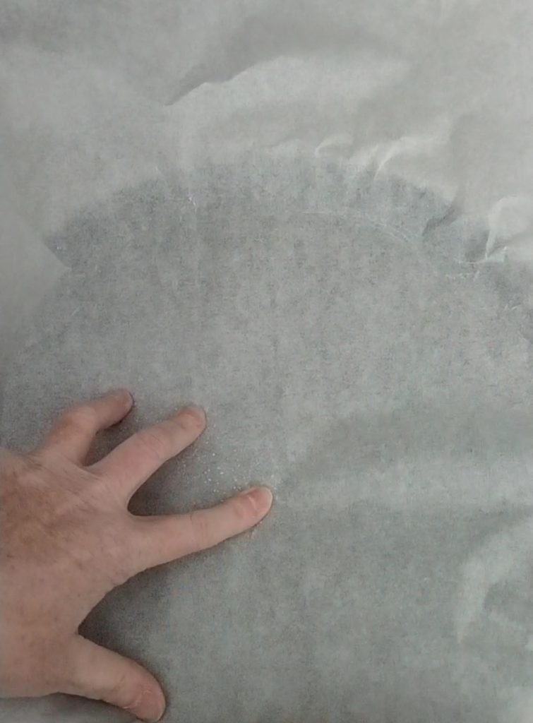 Place the parchment paper on a work surface, sprinkle a little flour on top, and roll out the first dough ball until you get the size of the imprinted circle.