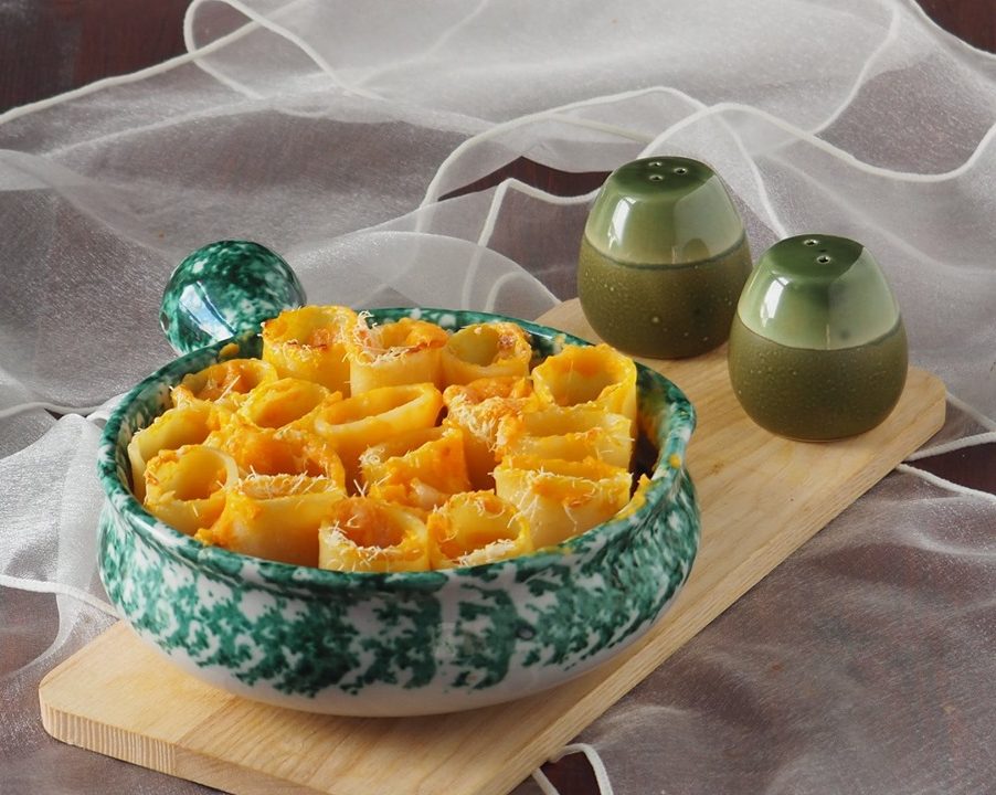 Take a large pot with plenty of water, as soon as it boils, add 3 tsp of coarse salt and the paccheri. Drain them with a colander 3 minutes before the cooking time indicated on the package. Line a 12×9 inch baking tray with parchment paper and place the paccheri upright vertically. Start filling them with two teaspoons of pumpkin mixture.