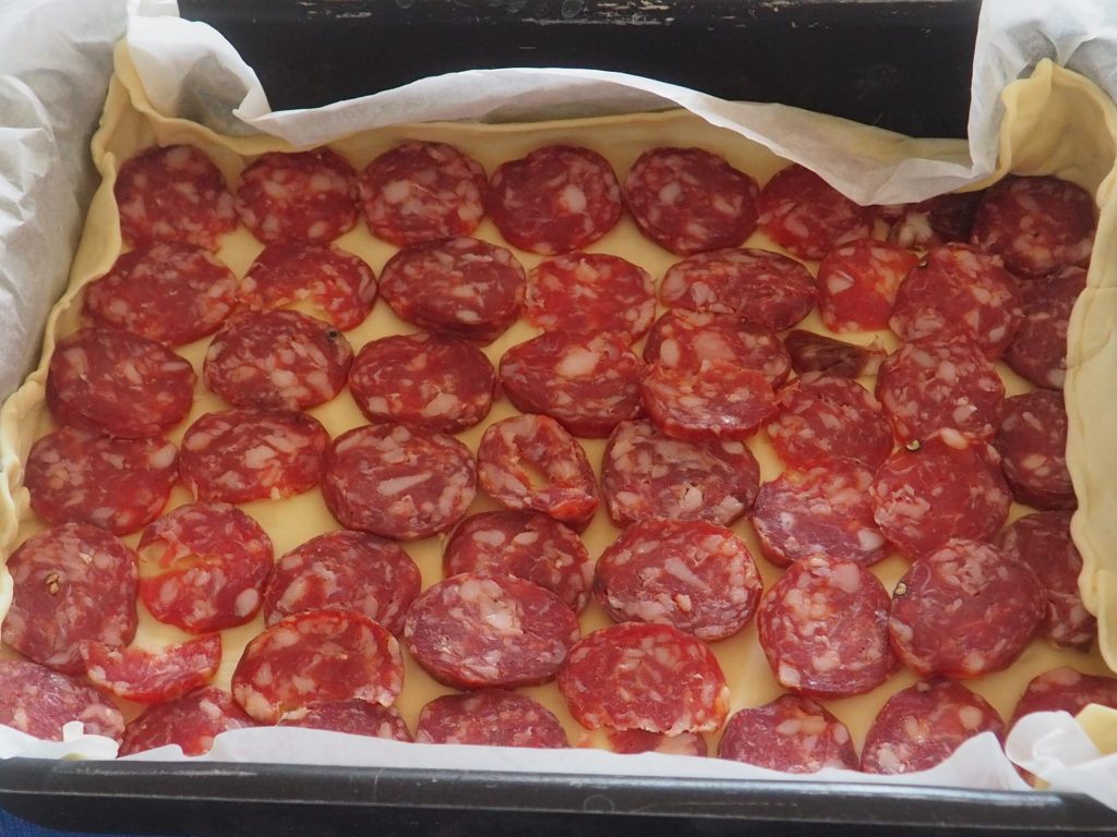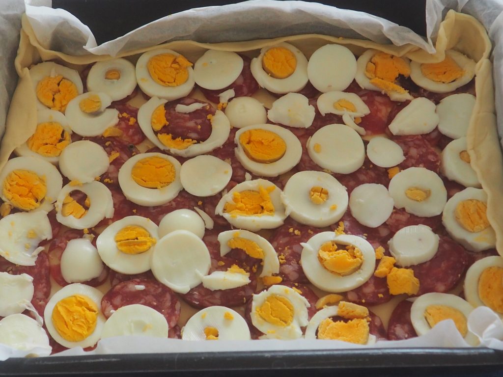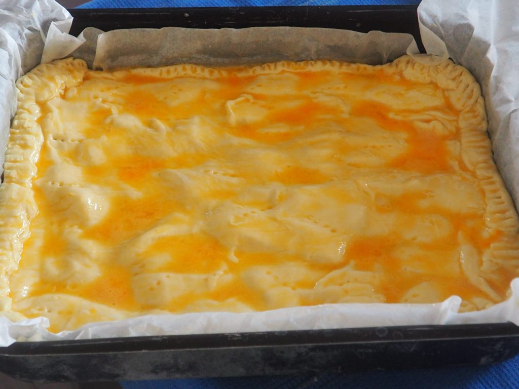 If you wish, you can add two or three beaten eggs with parsley to spread over the surface before covering it with the second puff pastry.