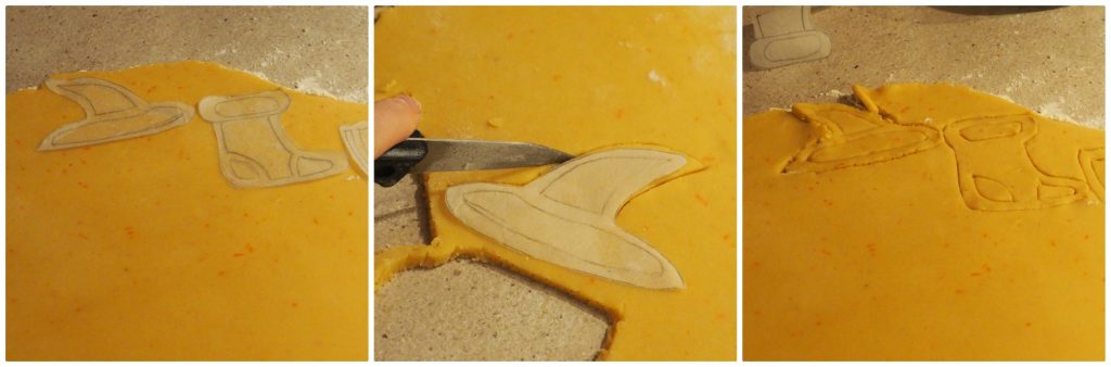 Since I didn’t have suitable cookie cutters, I drew on parchment paper the shapes I wanted to replicate as cookies: the hat, the broom, and Befana’s stocking.