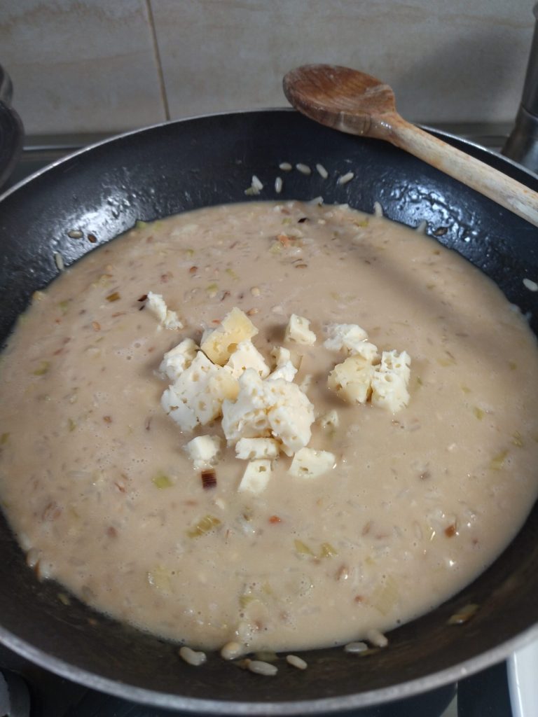 About five minutes before the Trio of Grains is done cooking, add the cubed pannerone, mix well, and adjust the salt if necessary.