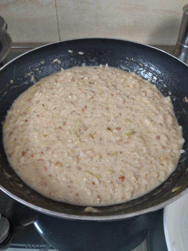 Add the Trio of Grains to the pan with the stewed leeks and toast for a few seconds.