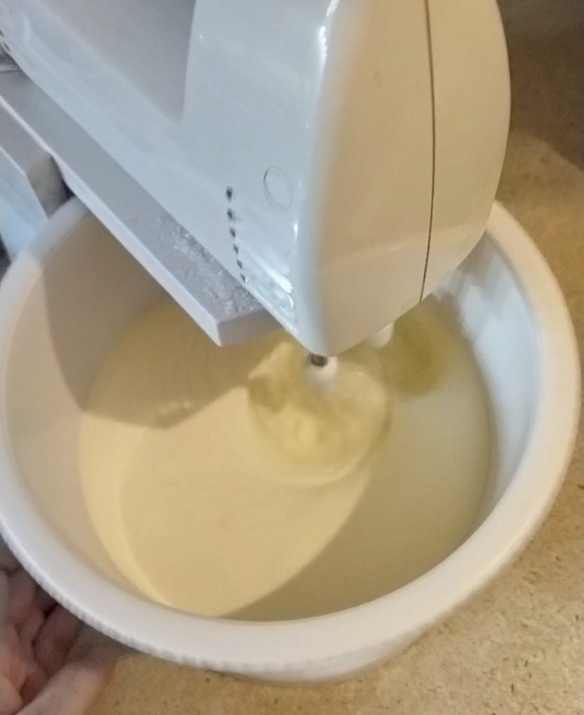 Now prepare the batter, put the eggs in a mixer and beat them well with the sugar. They should be very fluffy, it will take at least five minutes. Now gradually add the oil and milk, continue to beat everything with the whisk.