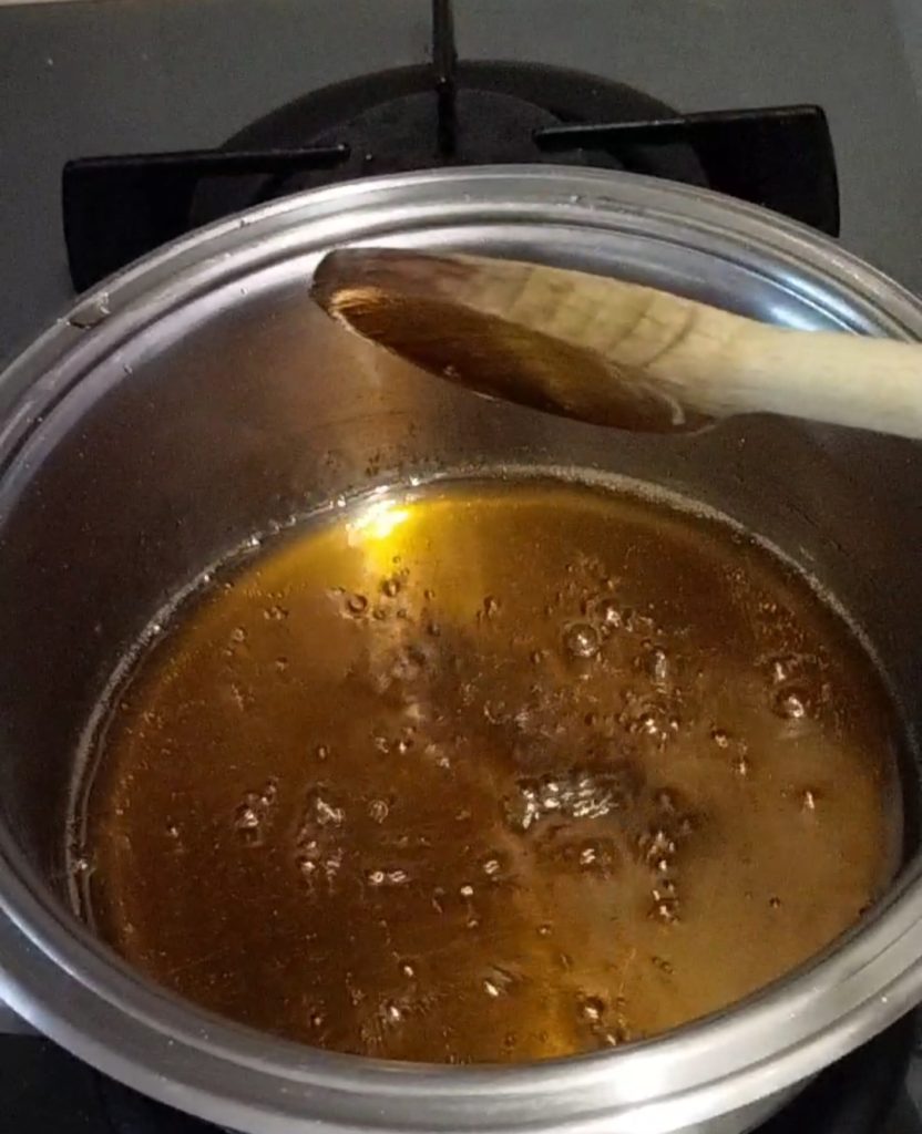 Put the sugar in a small saucepan, add the water, a pinch of salt, and heat over medium heat until it boils, stirring occasionally. The caramel will be ready when its color changes from light to golden, the temperature should be around 311°F – 329°F if you want it, like me, not too dark.