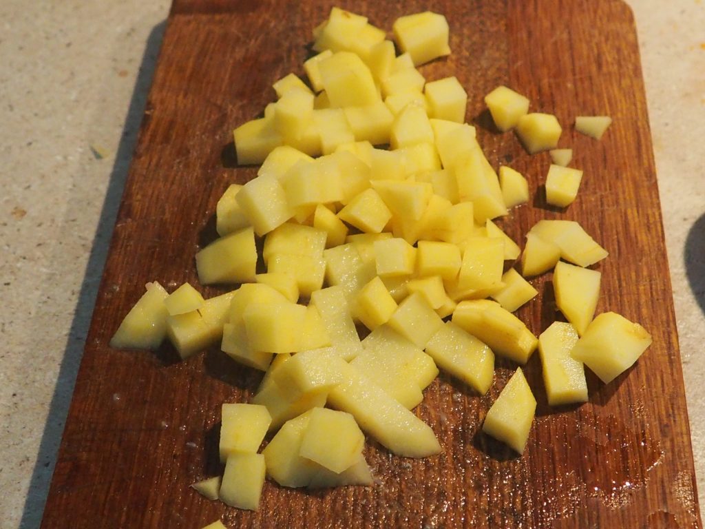 • Wash, peel, and cut the potato into cubes about one centimeter in size.