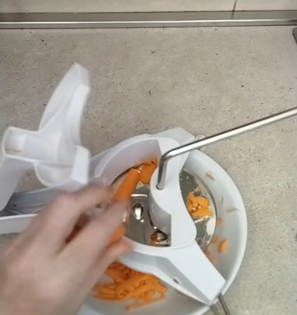 Meanwhile, wash and clean the carrots. Slice them into thin matchsticks, I used an old machine I had at home, but you can easily do it with a knife.