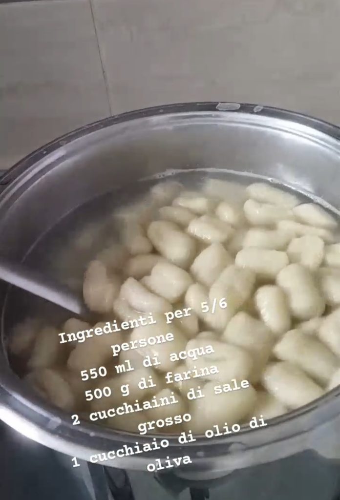 I’ll leave the link to the recipe here. For convenience, I’ll summarize the most important steps: put the water in a pot with salt and oil, as soon as it boils, turn off the heat and add the flour, pour onto a surface, knead quickly, make small logs and cut dough pieces.