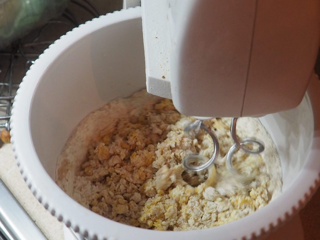In a mixer with dough hooks, place all the flours (all-purpose, whole wheat, rice flour, cornstarch), and start mixing them together.