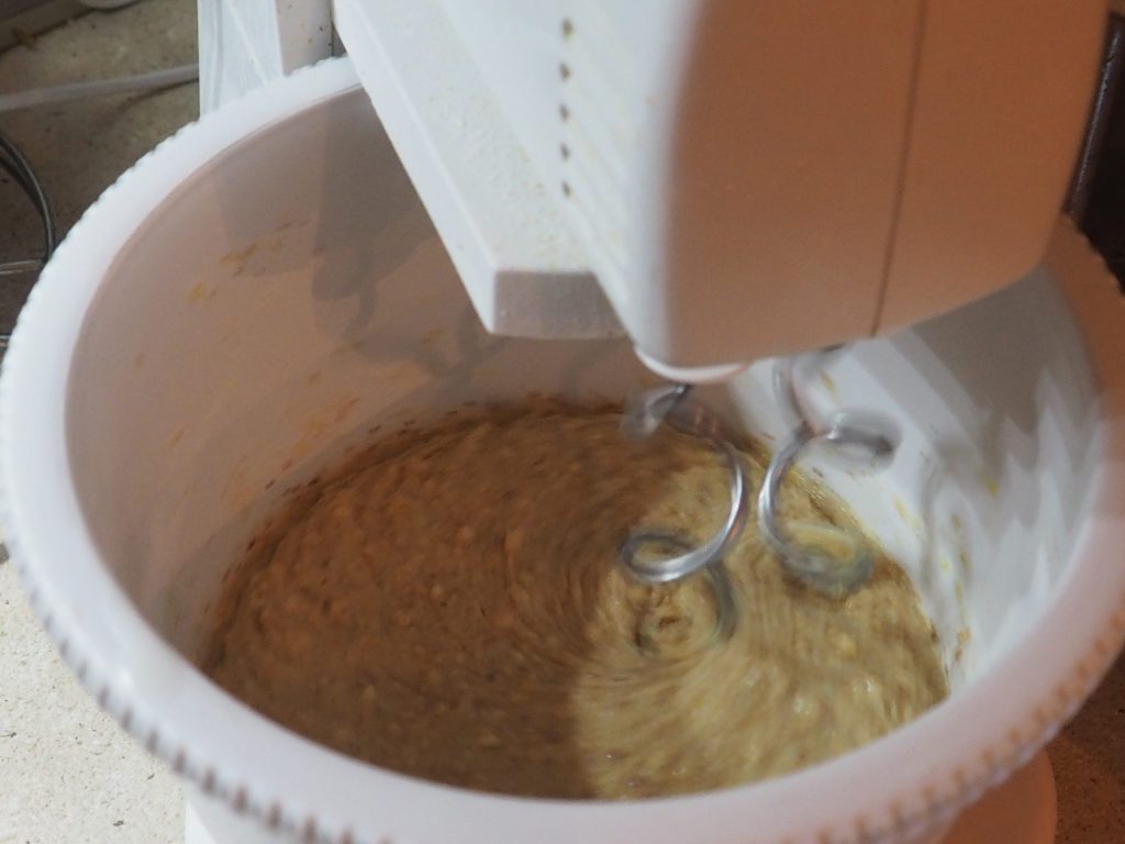At this point, add the room temperature eggs and continue mixing the ingredients.