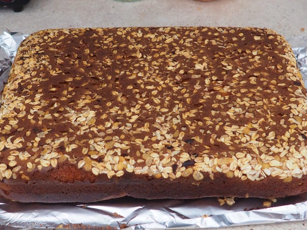 It will become a soft and very tall cake.Let it cool and then flip the cake so that the bottom side is facing upwards.
