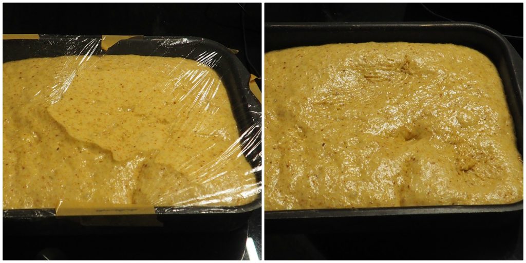 After the time has passed, the mixture will be nicely puffed and risen, remove the plastic wrap.