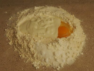 Place the flours in a mound with the baking powder, vanillin, and sugar on a pastry board (or in a bowl if you prefer).